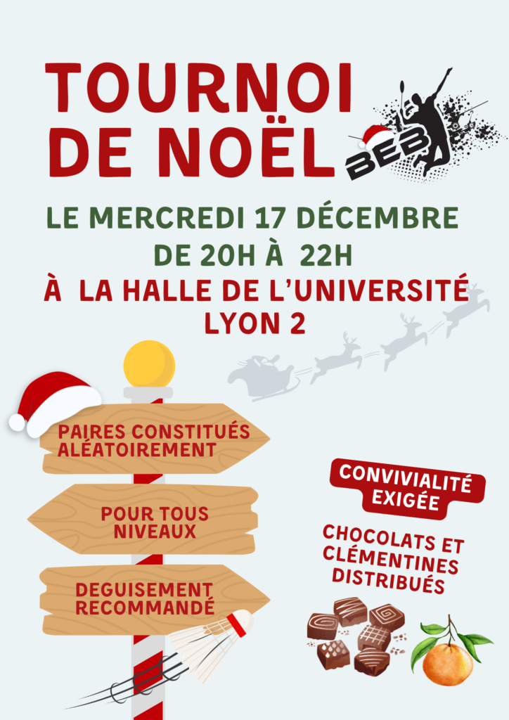 Pour bien terminer cette année 2025, les adhérents du BEB sont chaleureusement conviés à notre grand tournoi interne de Noël, qui aura lieu le mercredi 17 décembre 2025 à la halle de l’Université Lyon 2 !